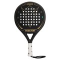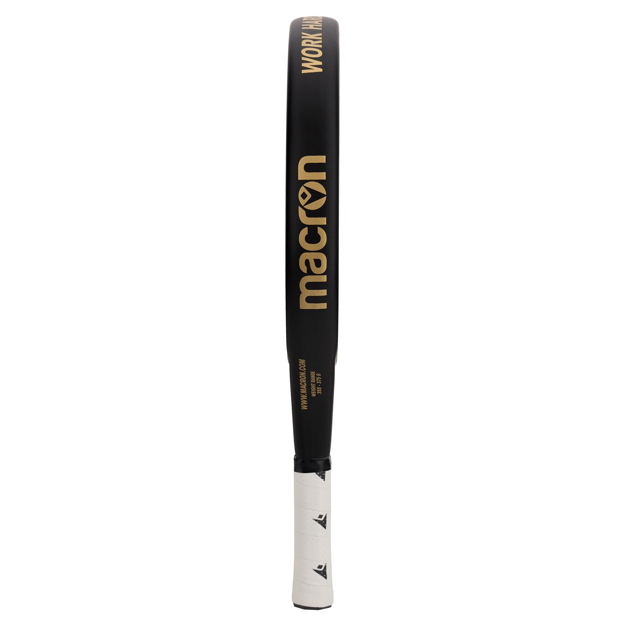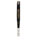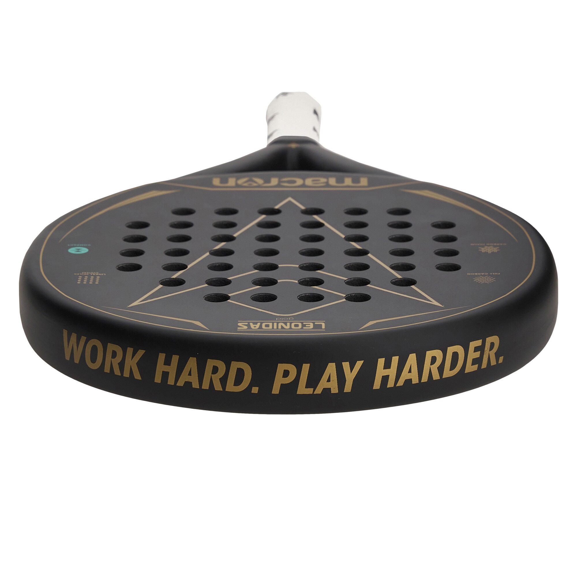 Macron præsenterer Leonidas Gold. Med moderne helt sort design med guldgrafik er den ideel til almindelige spillere, der ønsker en højtydende ketcher. Denne ketcher leverer seriøs kraft sammen med præcisionskontrol af bolden. Produceret i 100% 3K kulfiber med en EVA kompakt gummikerne, det giver spillere ekstrem let håndtering. Den runde form giver et stort, centralt sweet spot for at sikre maksimal kontrol. Macron HERO er afbildet i midten, mens der på kanten står 'Work Hard. Play Harder.', Macrons motto. Battet vejer 355-375 g.